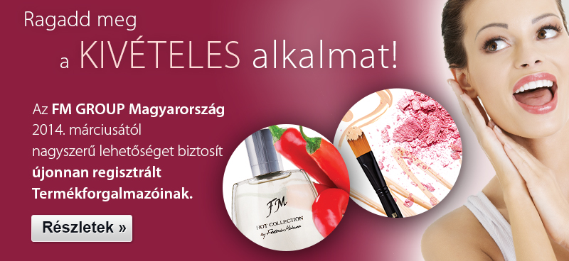 Az FM GROUP Magyarország 2014. márciusától nagyszerű lehetőséget biztosít ÚJONNAN regisztrált Termékforgalmazóinak! A regisztrációtól számított EGY hónapon belül 3 termék 30% kedvezménnyel rendelhető mindhárom katalógusból ( Parfüm, Make-up, For-home) 1-1 tetszőlegesen kiválasztott termékből jár a 30% kedvezmény a TAGI árból.